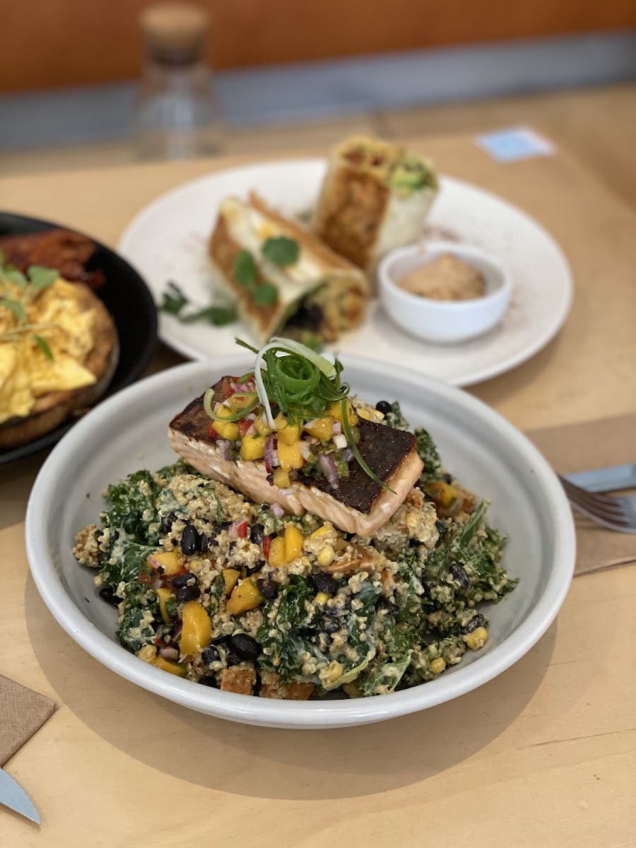 Coffee here gets genuine attention, with a strong local following for favorites like the lavender latte and consistently well-made flat whites and long blacks. Those who come for a caffeine fix appreciate the inviting aroma and meticulous preparation, while the food menu offers solid options that reflect care and seasonality—think morning burritos with tofu scramble, hearty chicken wraps, or fresh bowls that highlight seasonal produce. Pancakes and sweet treats like almond croissants and house-made protein balls round out the breakfast and brunch offerings, catering to a mix of dietary preferences including gluten-free and vegan choices.